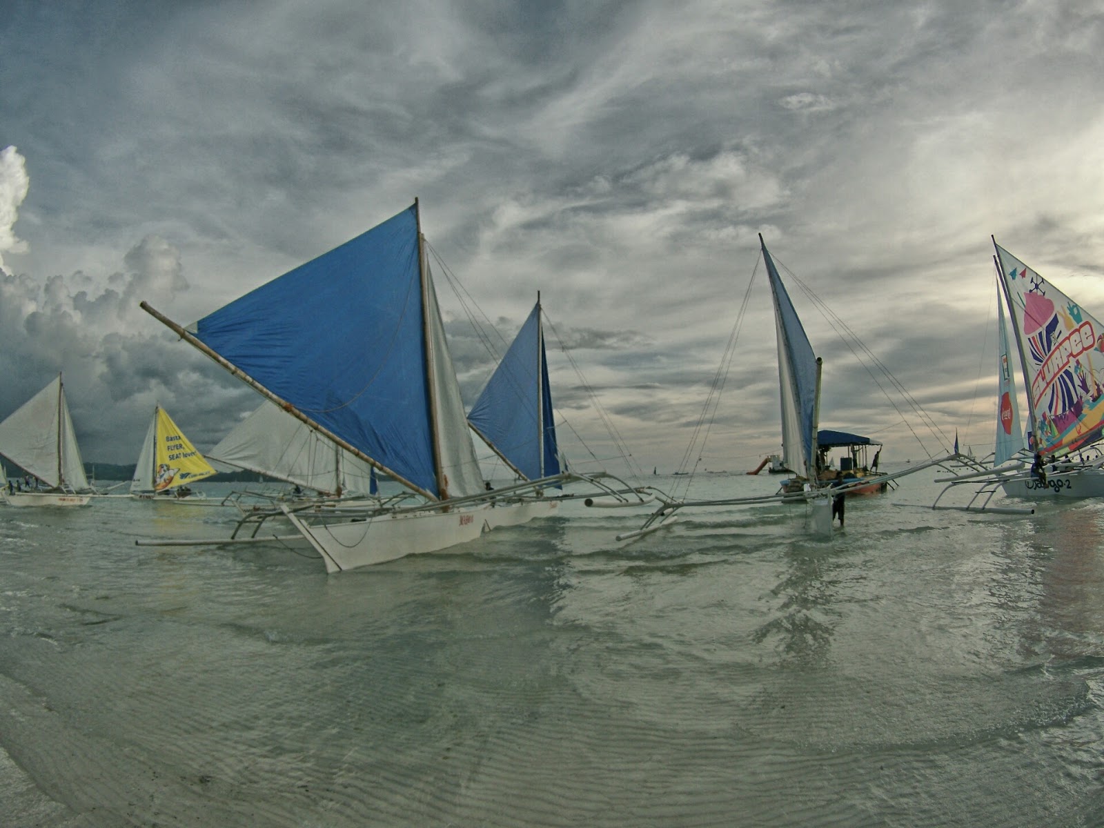Small boats, paraws and speed boats lined up along the shores of the White Beach.